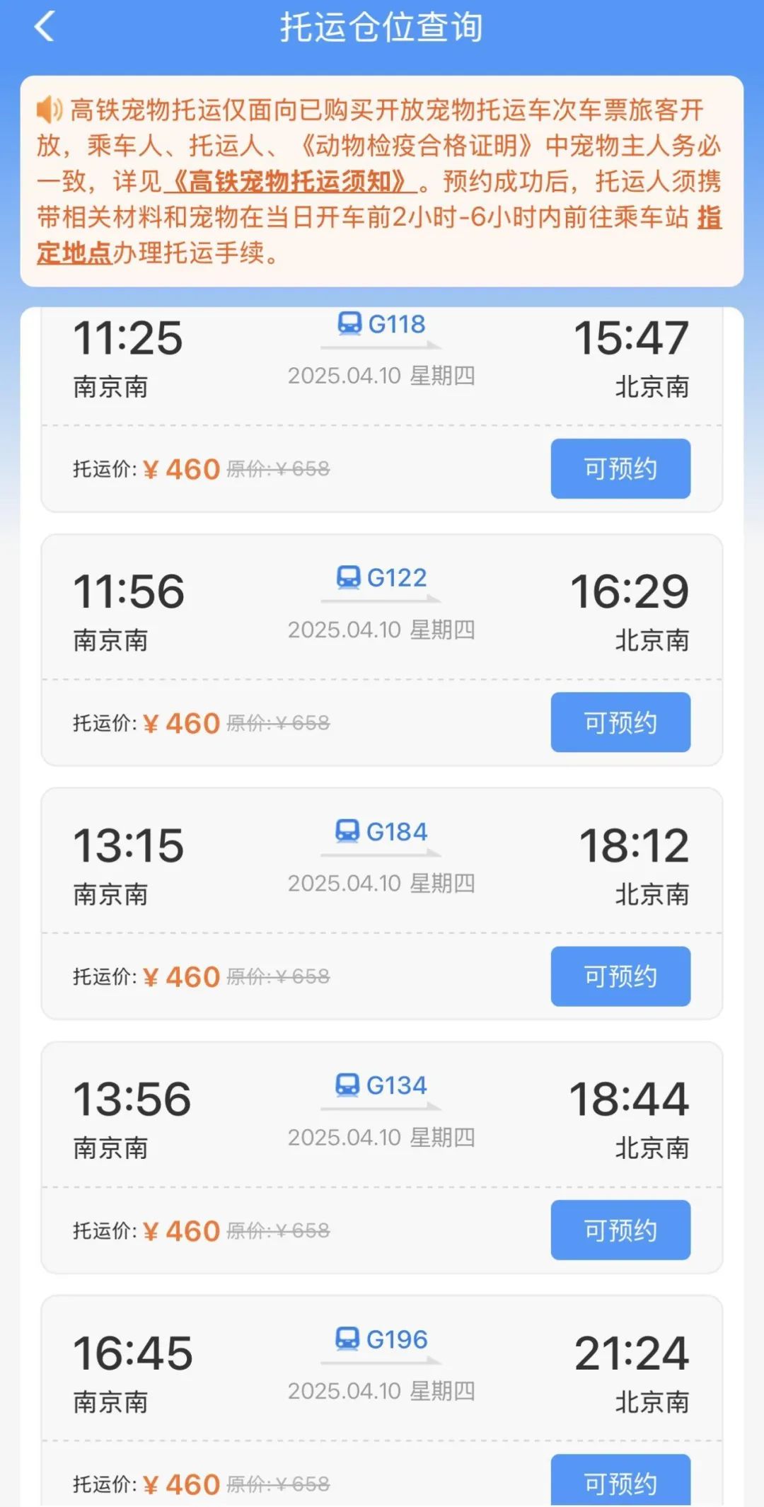 目前,高铁宠物托运服务处于试点阶段,可乘坐的车次仅限京沪高铁北京南、济南西、南京南、上海虹桥、杭州东等5座车站间的G119/118、G121/122、G127、G134、G183/184、G195/196等10趟列车。旅客提前2天及以上线上预约,预约成功后可同车托运1只家庭驯养且健康状况良好、单只体重不超过15公斤、肩高不超过40厘米的猫、犬类宠物。
