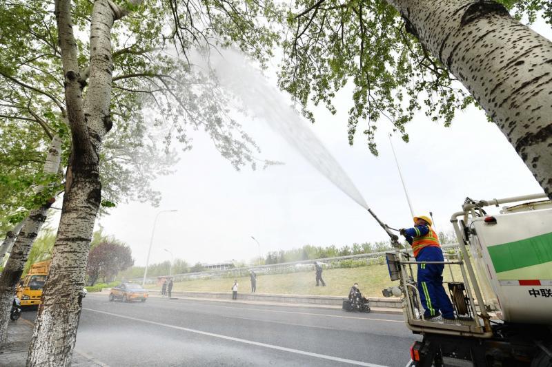 上午,北青报记者来到景泰桥西南角,高大的杨树分布在二环辅路上。只见一台高压喷水车缓缓驶来,瞄准树冠进行喷雾冲刷。“今年我们喷洒的不只是水,里面还融入了稀释后的凝絮剂。”市园林绿化局科技处处长姜英淑介绍说,凝絮剂附着在树冠上,能使杨柳絮在树上粘结、收缩,失去飞行能力,进而减少飞絮危害,起到物理防治效果。同时,凝絮剂为无毒无害、环境友好型高分子有机物,经过雨水和光照会自然降解。