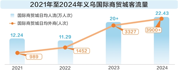 数据显示,2024年,义乌国际商贸城日均客流22.43万人次,同比增长12.15%;日均车流9.9万车次,同比增长5.48%;外商日均到访量超3900人次,同比增长17.22%,全年吸引进入市场的全球采购商超百万人次,覆盖230多个国家和地区,市场主要客流量指标均创近10年新高,中东、东南亚、拉美等新兴市场采购份额持续提升。