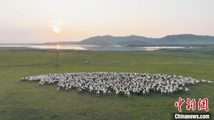 2024年7月25日,内蒙古呼伦贝尔,羊群迎着夕阳回家。王卓摄