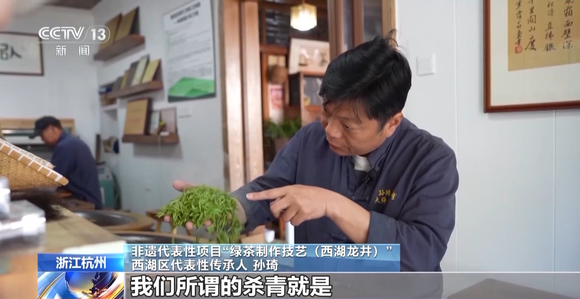 非遗代表性项目“绿茶制作技艺(西湖龙井)”西湖区代表性传承人孙琦:杀青就是让它快速地走水,西湖龙井是色绿、香郁、味甘、形美。