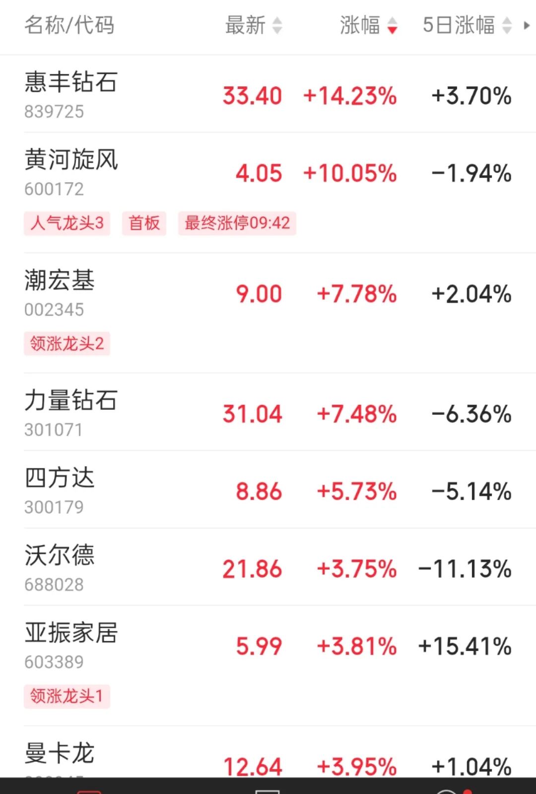 其中,黄河旋风涨停,潮宏基、力量钻石涨超7%,四方达涨超5%,沃尔德、曼卡龙跟涨。