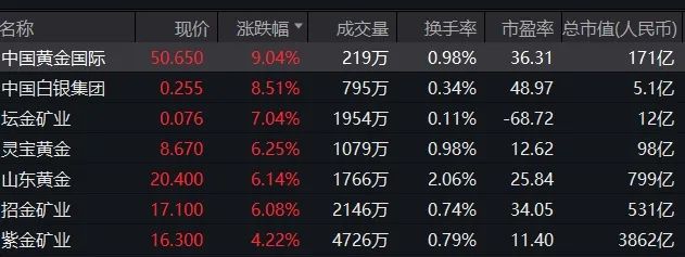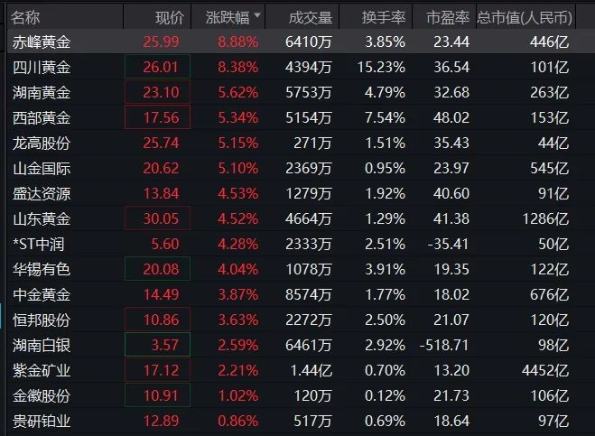 个股方面,A股市场黄金股集体走强。其中,赤峰黄金、四川黄金涨超8%,潮宏基涨超6%,登云股份、晓程科技涨超5%,湖南黄金、鹏欣资源、盛达资源、恒星科技、西部黄金、明牌珠宝涨超4%。
