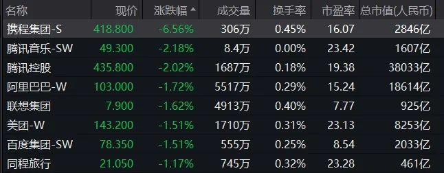盘面上,港股大型科技股普遍走低,腾讯跌超2%,阿里巴巴跌近2%,百度跌超1%,小米、快手、美团、京东皆飘绿。