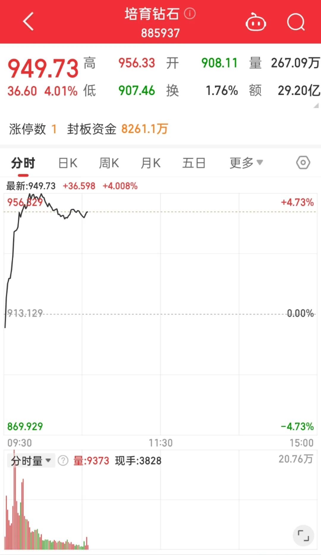 A股培育钻石股拉升上涨,截至发稿,相关指数上涨4.01%。