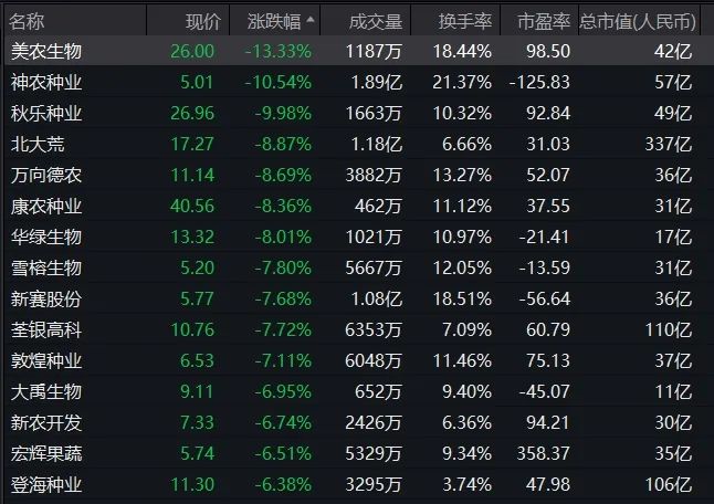 A股农业股继续昨日回调行情。其中,神农种业跌超10%,北大荒、万向德农跌超8%,丰乐种业、新赛股份、敦煌种业跌超7%,宏辉果蔬、大北农跌超6%。