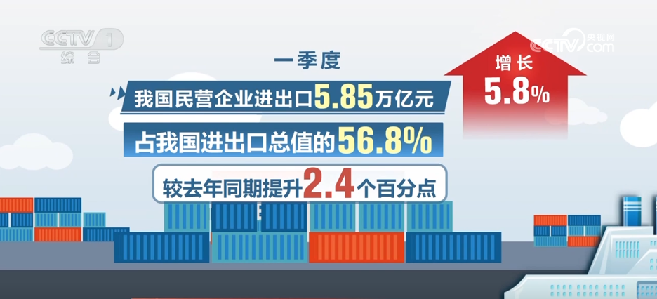 一季度,我国民营企业进出口5.85万亿元,增长5.8%,占我国进出口总值的56.8%,较去年同期提升2.4个百分点。同期,外商投资企业进出口2.99万亿元,增长0.4%,占进出口总值的29%。