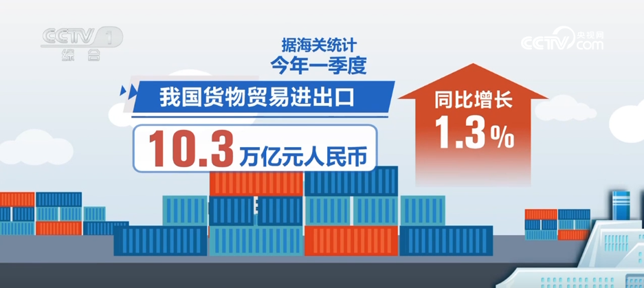 据海关统计,今年一季度,我国货物贸易进出口10.3万亿元人民币,同比增长1.3%。其中,出口6.13万亿元,增长6.9%;进口4.17万亿元,下降6%。一季度,我国进出口规模创历史同期新高,连续8个季度超10万亿元。从月度走势看,1月份进出口下降2.2%,2月份基本持平,3月份增长6%。