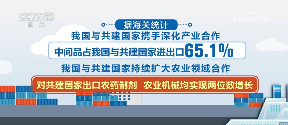据海关统计,我国与共建国家携手深化产业合作,中间品占我国与共建国家进出口的65.1%。我国与共建国家持续扩大农业领域合作,对共建国家出口农药制剂、农业机械均实现两位数增长;自共建国家禽肉、干鲜瓜果进口量分别增加32.9%、8.5%。我国支持共建国家不断改善交通、能源基础设施条件,对共建国家出口轨道交通装备、电动机及发电机、风力发电机组增长均超过一成。