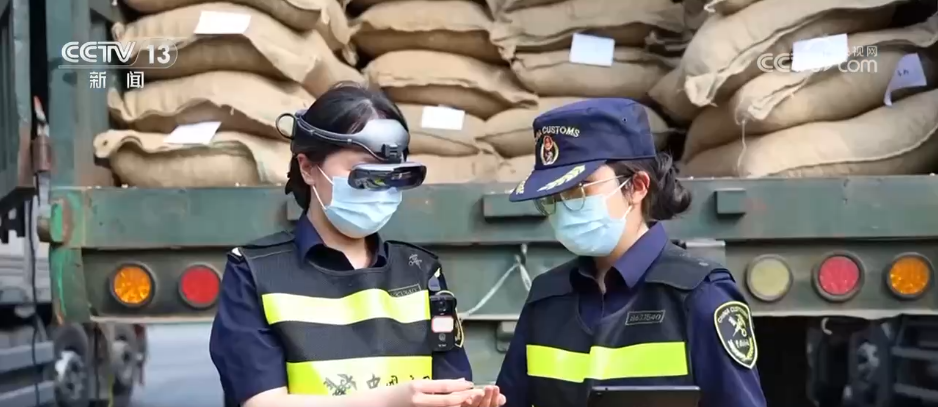 在河口公路口岸北山国际货场进口查验区,昆明海关所属河口海关关员正在运用AR眼镜对一批23.2吨、自越南进口的中药材鸡血藤进行现场检疫查验。
