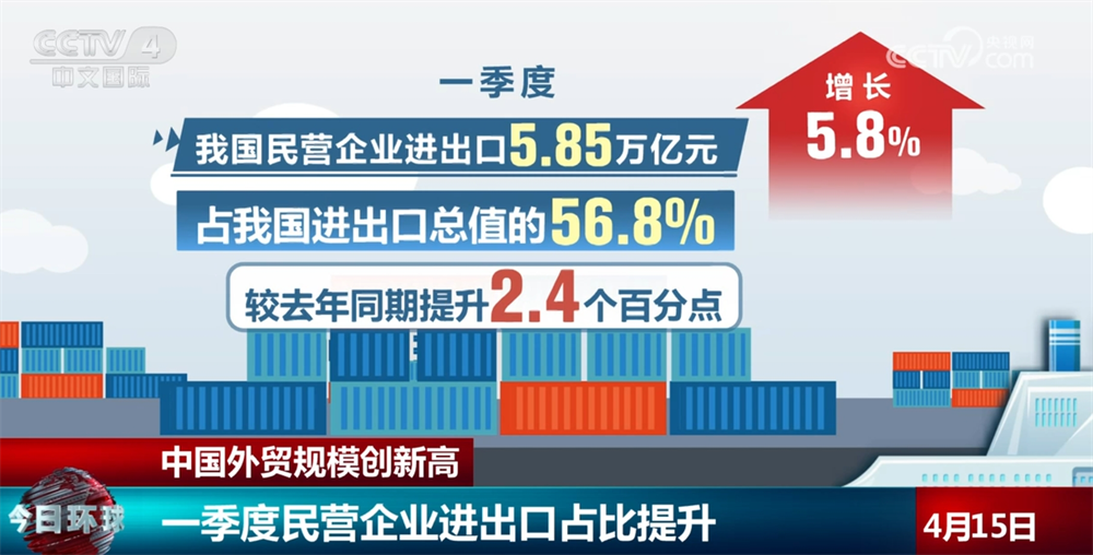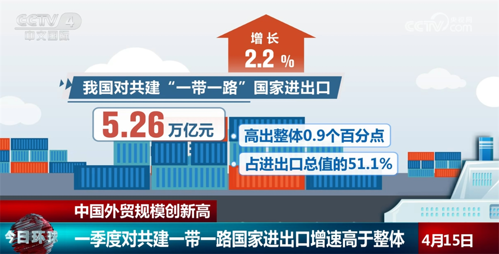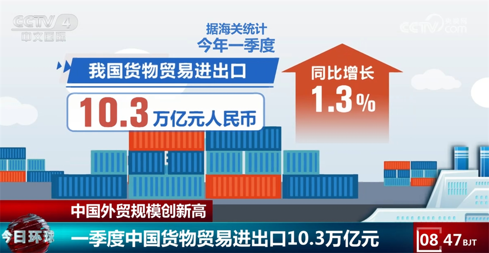 来关注中国经济。国务院新闻办公室14日举行新闻发布会,公布今年一季度货物贸易进出口情况。今年一季度,中国货物贸易进出口10.3万亿元,进出口规模创历史同期新高。