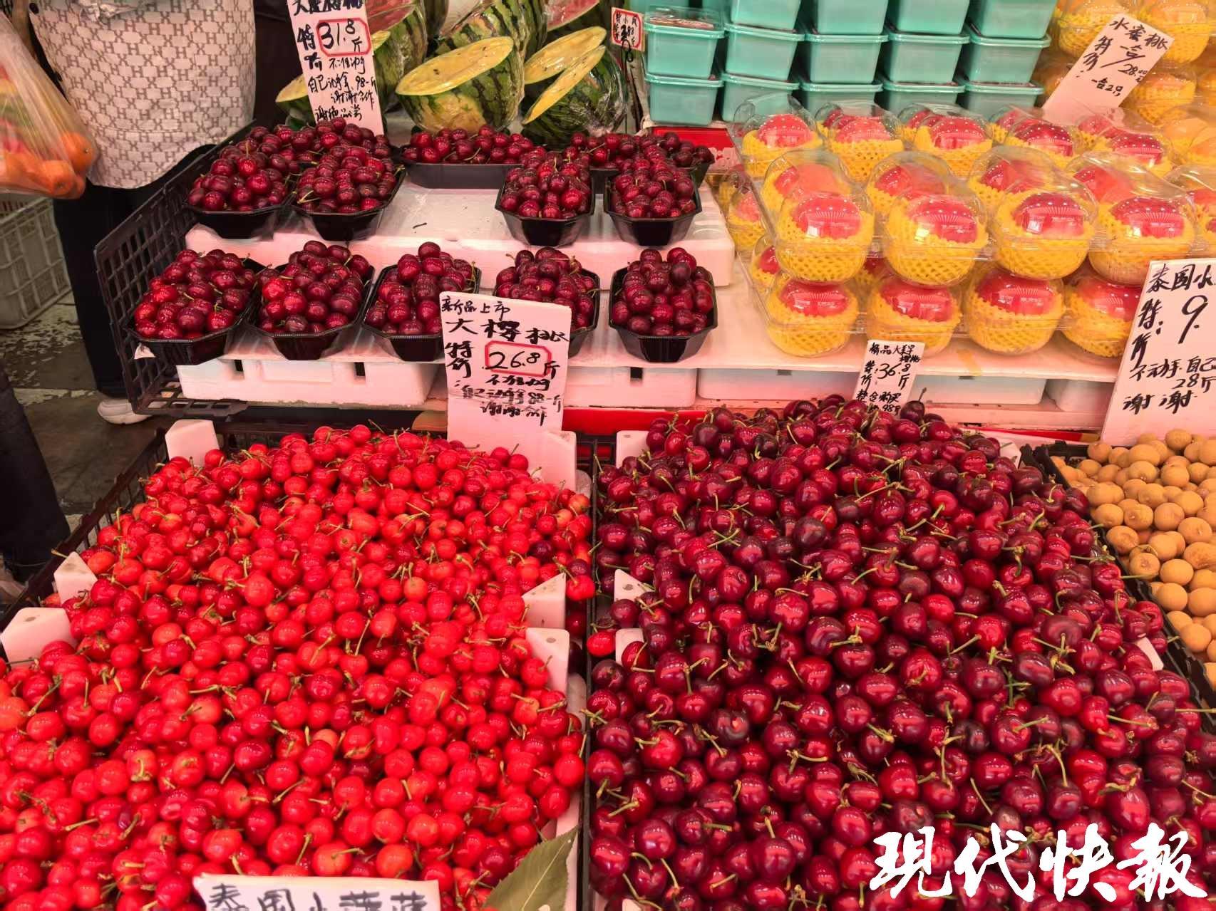 眼下国产樱桃大量上市,看起来个大饱满。“现在的樱桃来自辽宁大连,新鲜度很高,从大棚里摘下来到货架上只有两三天时间。”摊主告诉记者,国产樱桃从26.8一斤到75元一斤不等。个头较小的樱桃17.8元一斤。等到山东大棚樱桃集中上市,价格会逐渐走低。
