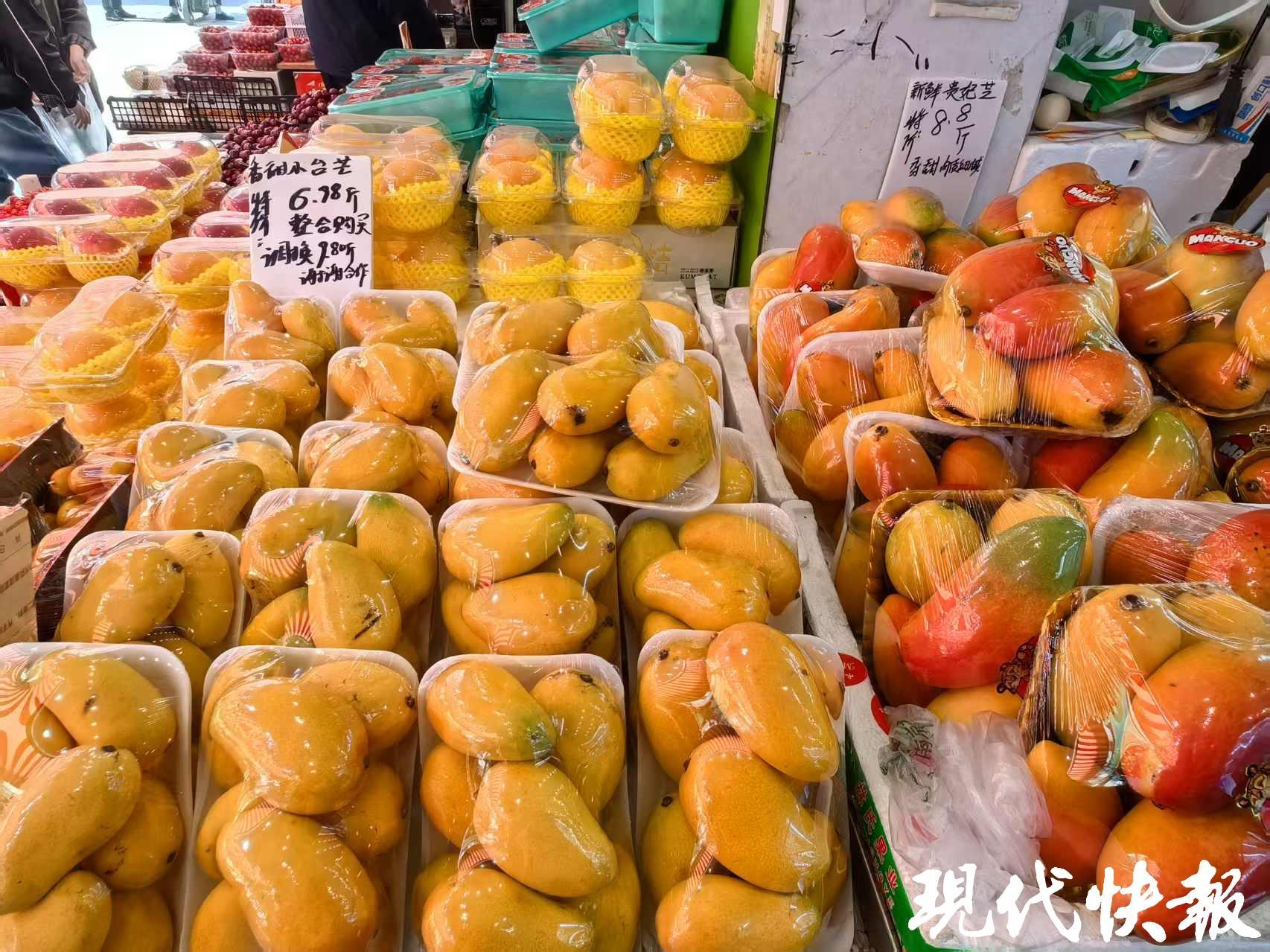 小巧圆润的小番茄、芒果、枇杷的人气也很高。小台芒7元一斤、水仙芒7.8元一斤、贵妃芒8.8元一斤……五彩缤纷的芒果飘着清新的香气,大多来自海南、云南、广西等地。