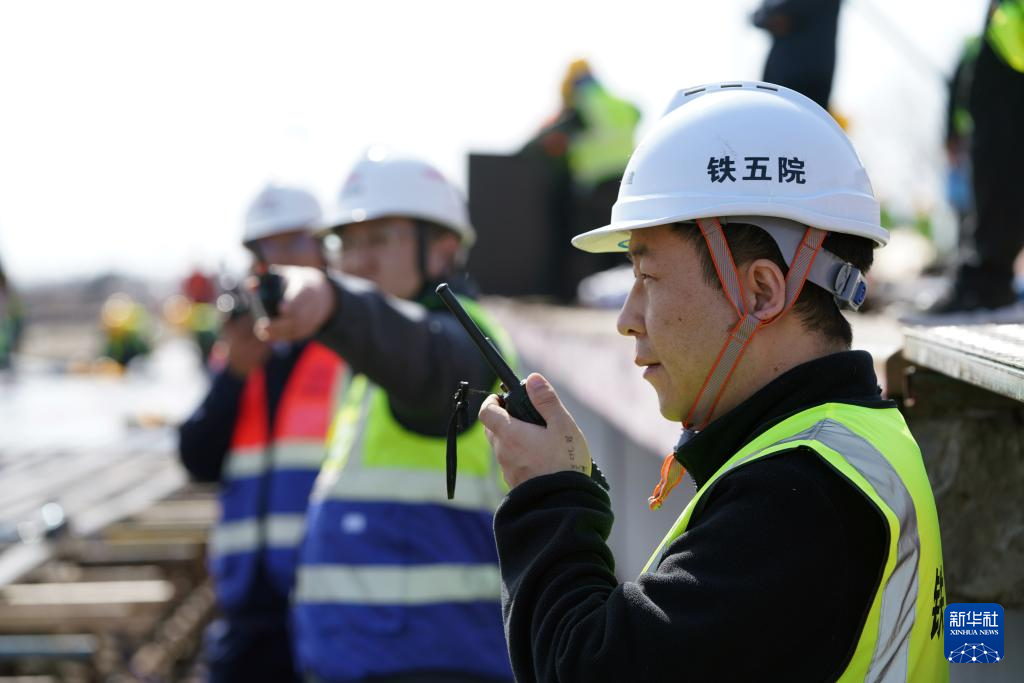 4月14日,工作人员在佳同铁路扩能改造工程富锦站改造现场勘察复核工程项目数据。新华社记者王松摄