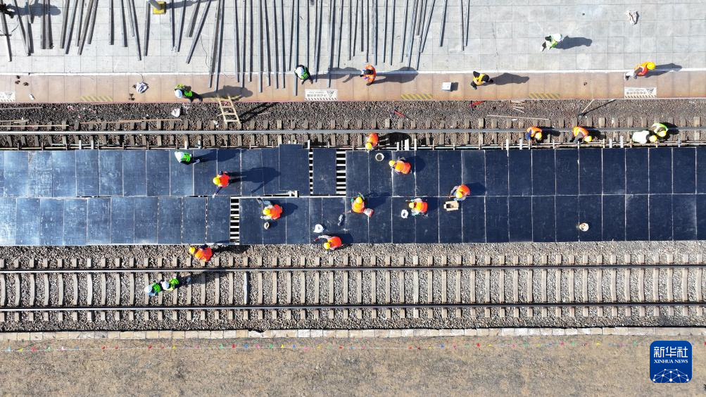 4月14日,佳同铁路扩能改造工程富锦站内施工人员在进行临时站台搭建施工作业(无人机照片)。新华社发(吴雨南摄)