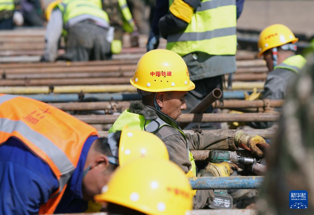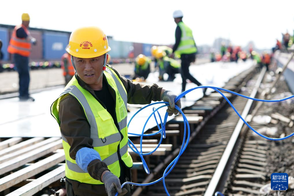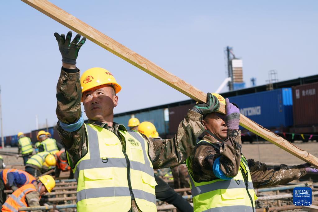 4月14日,工人在佳同铁路扩能改造工程富锦站改造现场施工。新华社记者王松摄