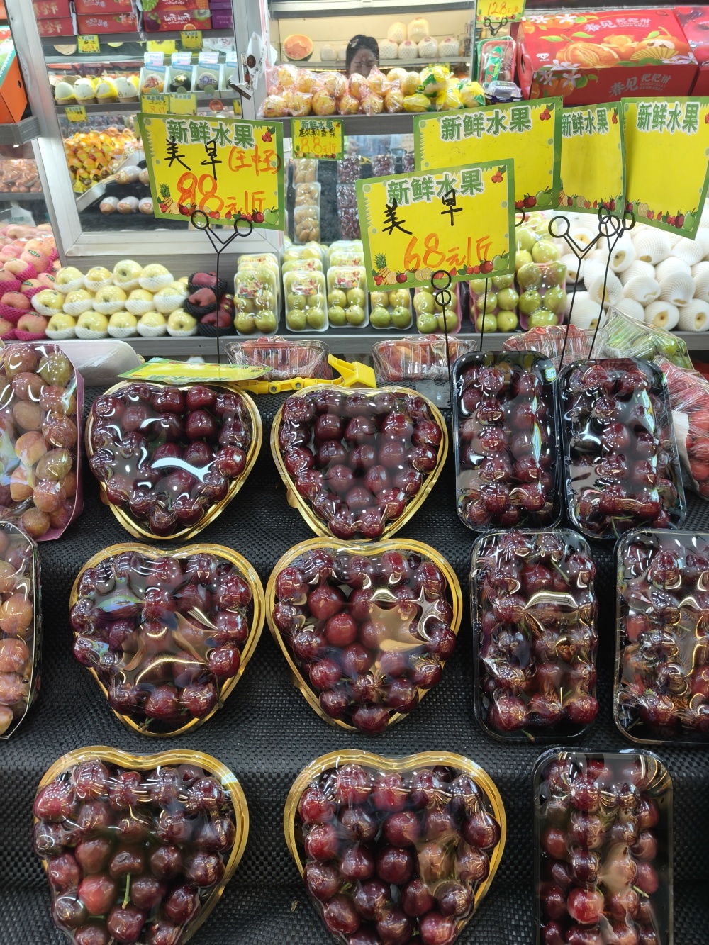 在靶场路的一家水果店内,美早樱桃分别标价68元/斤和88元/斤。从色泽来看,与车厘子十分相似。标价不同,二者有什么区别?“个大个小,品种都一样。”商家表示,顾客选择68元的较多,性价比高。