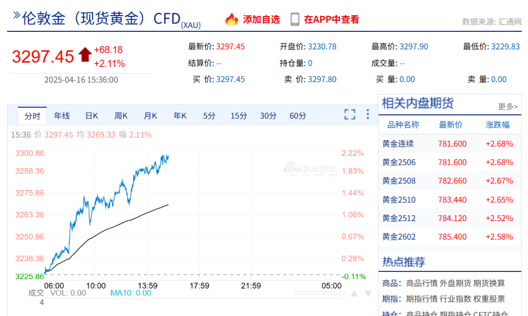 4月16日,现货黄金价格再创新高。截至发稿,现货黄金报3297.45美元/盎司,涨幅2.11%,最高报3297.90美元/盎司。随后,金价相关话题再次冲上热搜。