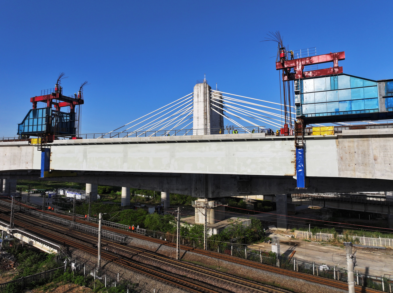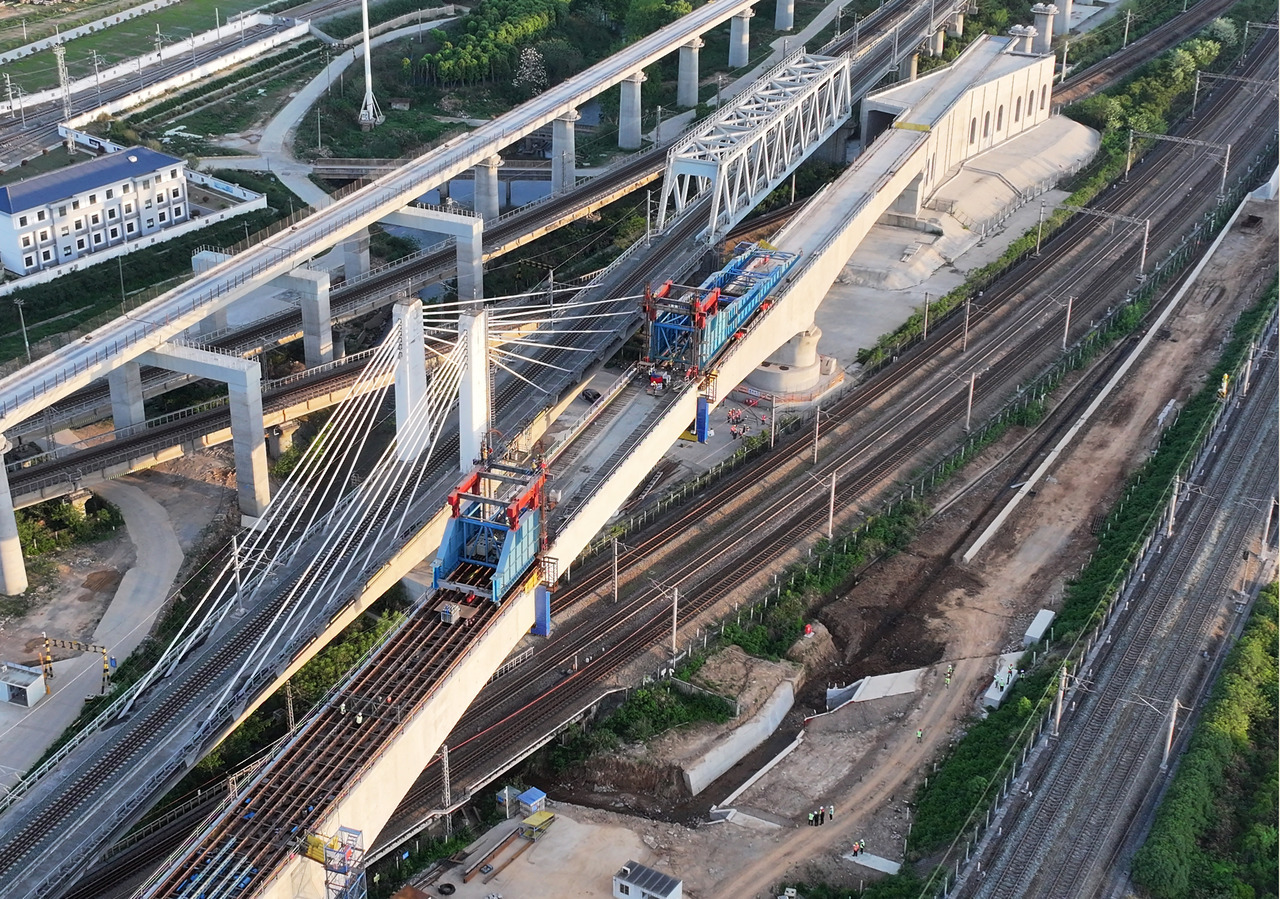 昌九高铁采用国内首创“钢梁大纵坡下坡驮运”技术,让左线跨杭瑞高速特大桥(74+150+74)米钢混连续梁最后一段钢箱梁,安全跨越了京九铁路上、下行正线和武九铁路西南下行联络线3条铁路大动脉,精准稳固地驮运至设计合龙口位置上方,破解了大纵坡、大跨度、大吨位钢箱梁安装的难题,为钢箱梁正式落梁合龙奠定了坚实基础。