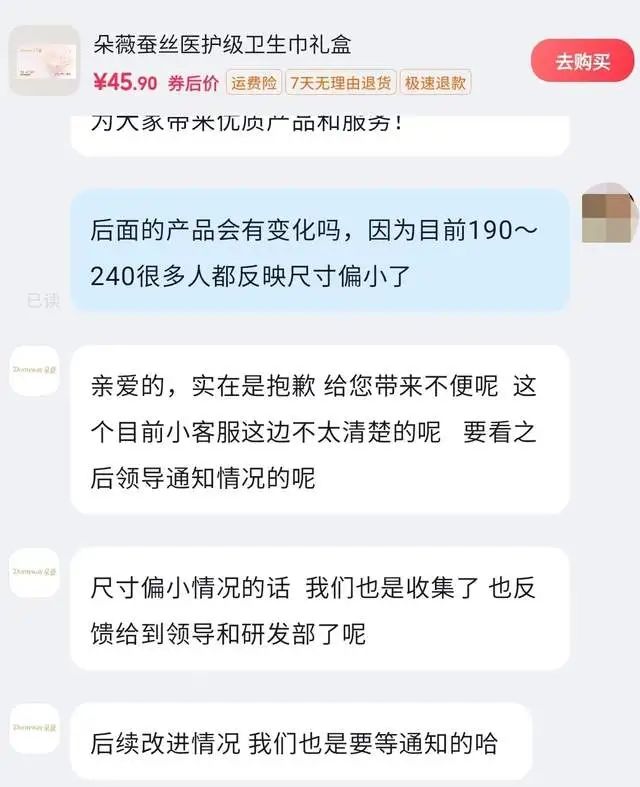 4月17日,经视直播记者联系上生产厂家——浙江朵薇护理用品有限公司,将网友意见反映给了厂家工作人员。工作人员回应称,会反映到各个部门,也会跟生产部门沟通下。朵薇官方旗舰店客服也告诉记者,厂家已经收到了尺寸偏小的用户反馈,下一批产品计划于5到6月份上市。