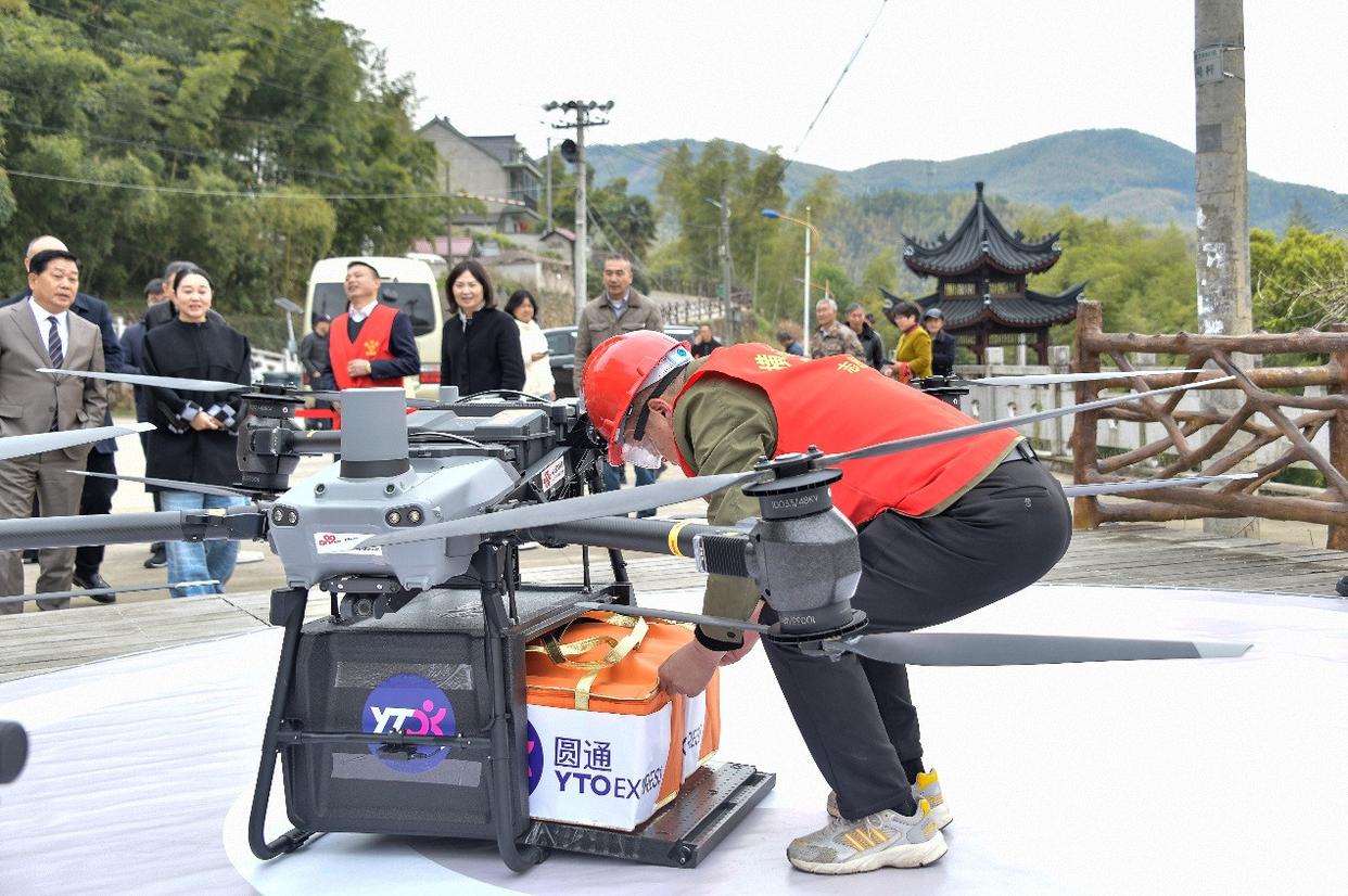 随着“唰唰唰”的螺旋桨声,一架无人机稳稳降落在桐庐县横村镇凤联村宋家自然村老年活动中心前的空地上。