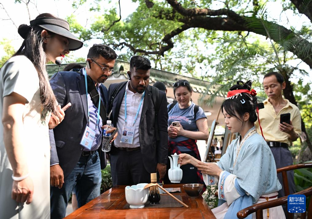 4月17日,在广州兰圃,参加第137届广交会的境外采购商观看茶艺表演。