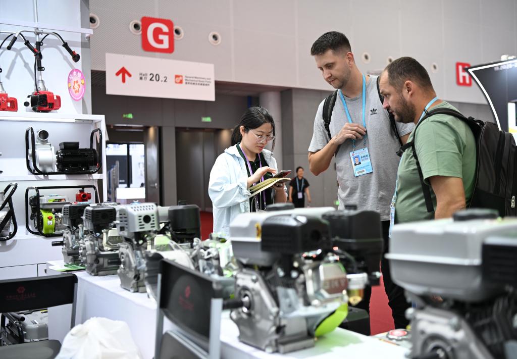 4月15日,境外采购商在机电产品展区洽谈。新华社记者 邓华摄