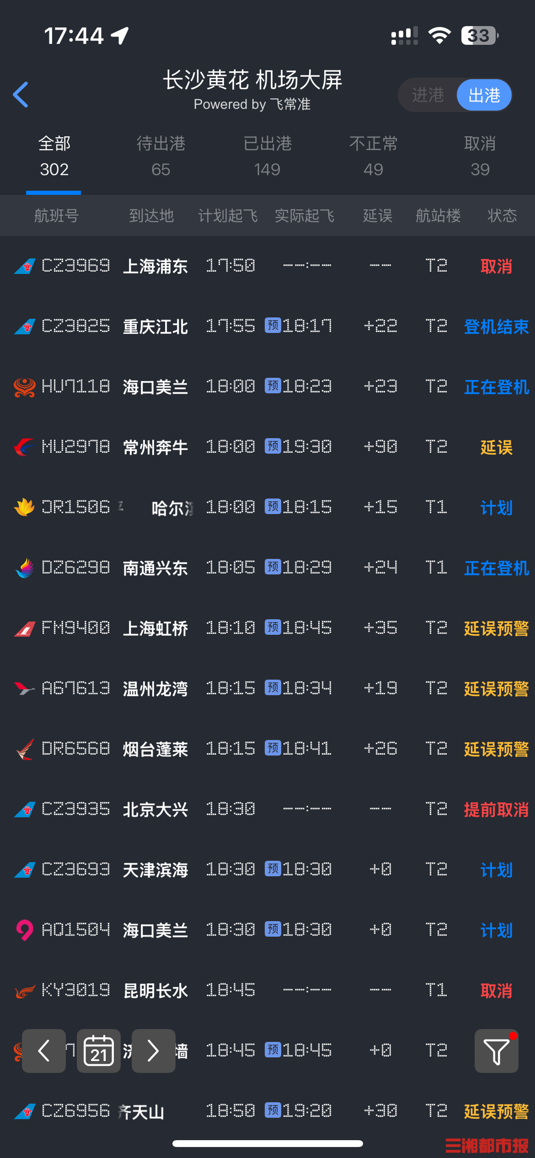 记者从飞常准APP获悉,截至21日17时45分,长沙机场显示为小面积延误,并提示“特情通报”。通报内容显示,“长沙黄花机场目前天气雨,当前进港航班已开始备降”。从不正常航班趋势上看,21日16时后,长沙机场不正常航班数量开始出现上升。