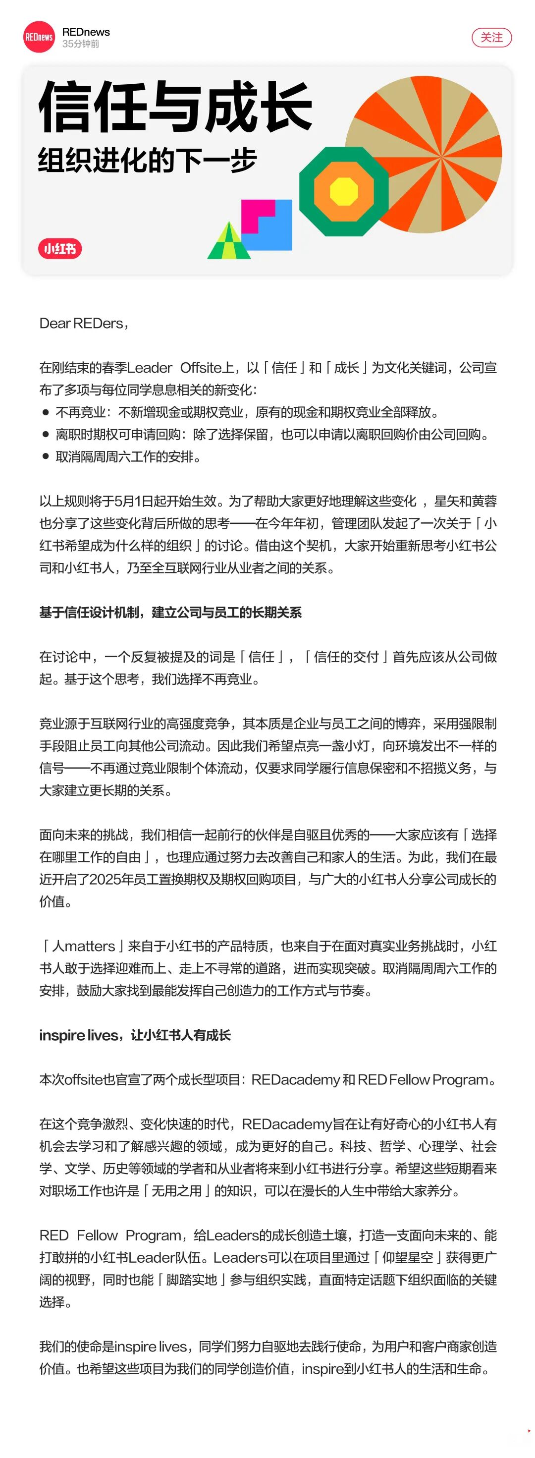 4月24日,小红书发布全员信,称公司基于信任设计机制,致力于建立与员工的长期关系。小红书宣布将从5月1日起,不新增现金或期权竞业,原有的现金和期权竞业全部释放。