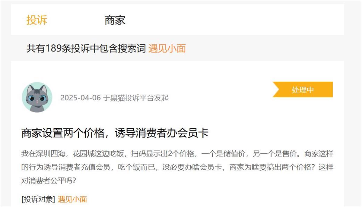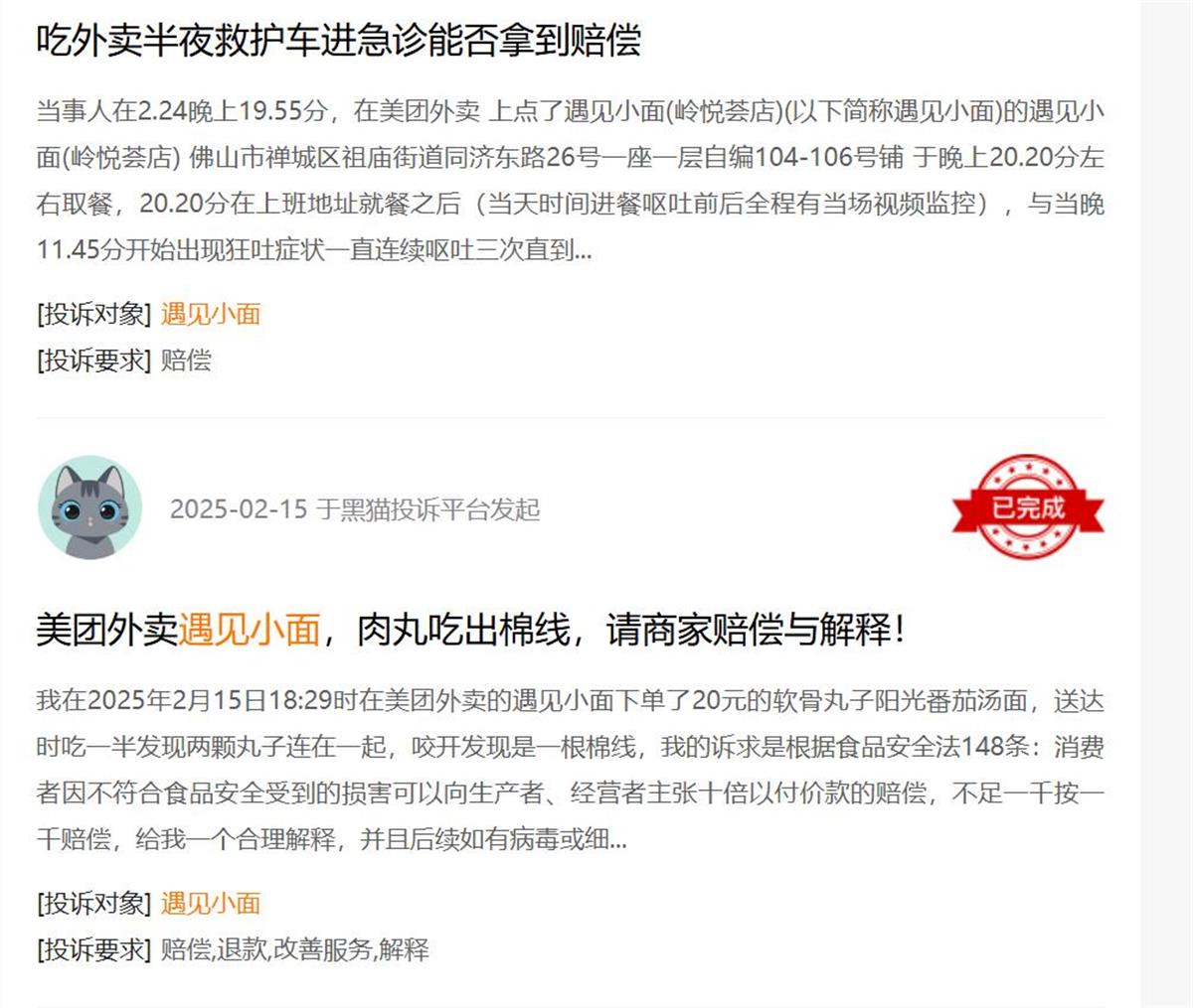 黑猫投诉平台数据显示,截至2025年4月24日,遇见小面累计投诉达189条,其中多条涉及食品安全问题,包括吃出棉线、毛发等异物,以及食用后呕吐、腹泻需送医治疗等情况。尽管部分投诉已完成处理,但整体投诉解决率不足三成。