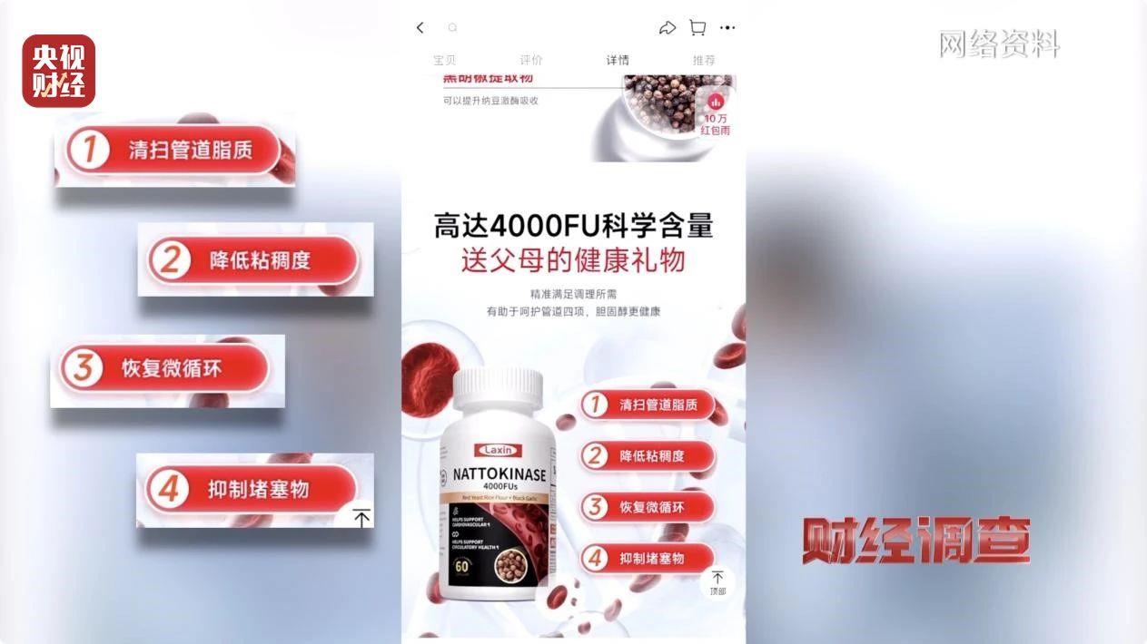 除此之外,在产品的详情页面中,更是表示该产品具有四大功效:扫清管道脂质、降低黏稠度、恢复微循环、抑制堵塞物。记者发现,销售页面没有任何关于产品类别的展示,经过询问,客服表示,产品并非药品,而是保健品。