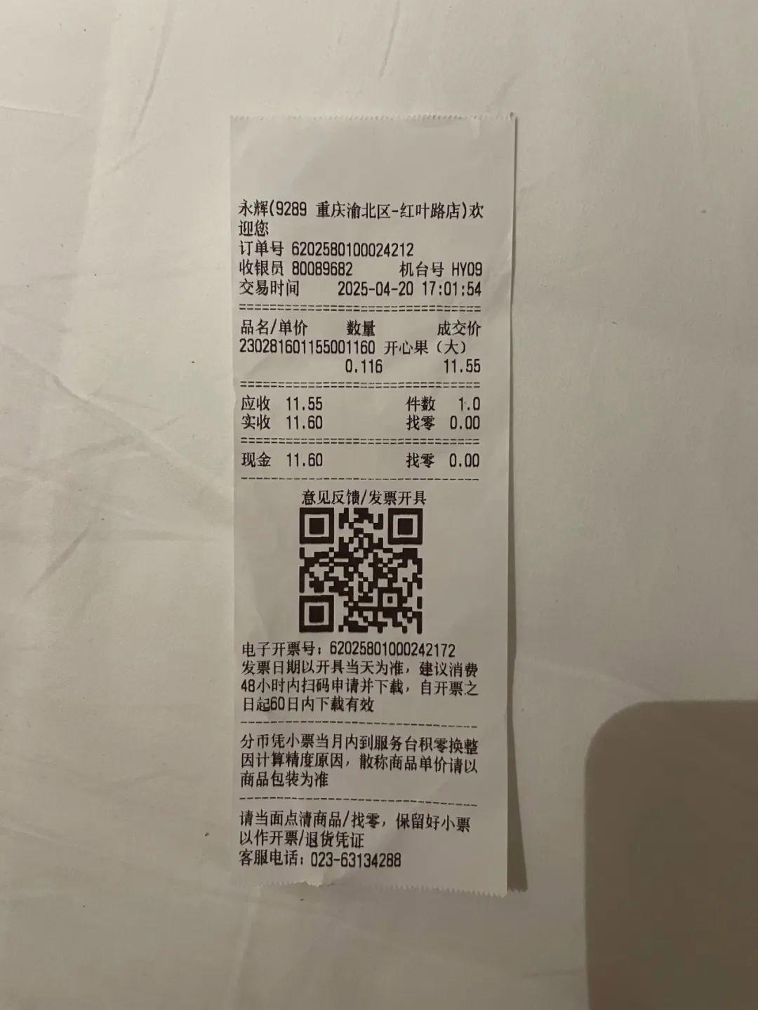 值得注意的是,这一现象并非偶然。调查发现,该现象在永辉重庆区域门店呈系统性存在:红叶路店标价11.55元的开心果,实收了11.6元;观音桥店标价3.45元的黑芝麻丸,实收了3.5元;龙头寺店标价0.66元的玉米珍,实收了0.7元;较场口店标价4.97元的绿豆糕,实收了5元。消费者在购买标价为分位非整数的商品时,均被自动“五入”收取更高金额。