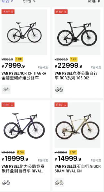迪卡侬官方小程序也显示,目前有部分中高端车型有促销优惠,打折幅度从7.5折-9.4折。其中包括迪卡侬旗下的高端公路自行车品牌VAN RYSE,一款公路车从29999元降价到22999元,降价7000元。