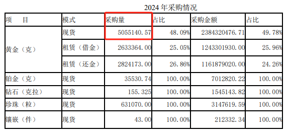 随着金价的上涨,明牌珠宝2024年度采购的黄金数量和金额均明显下降,全年共采购了5吨多(5055千克)的黄金,比2023年的7.6吨多(7622千克)减少了2.5吨多;采购金额23.84亿元,比2023年的30.12亿元下降了两成多。同时,公司的门店也大幅下降,全年门店数量减少了76家。