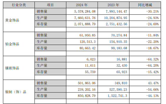明牌珠宝是浙江绍兴上市企业,于2011年登陆深交所,主要从事黄金、铂金等中高档贵金属和宝石首饰产品的设计、研发、生产及销售,核心业务是对“明牌珠宝”“明牌传家金”“明牌小金喜”品牌的连锁经营管理。2024年年报显示,公司黄金饰品全年的营收为29.95亿元,营收占比76.14%,营收同比2023年度的36.62亿元下降18.21%,营收占比下降16.88个百分点。