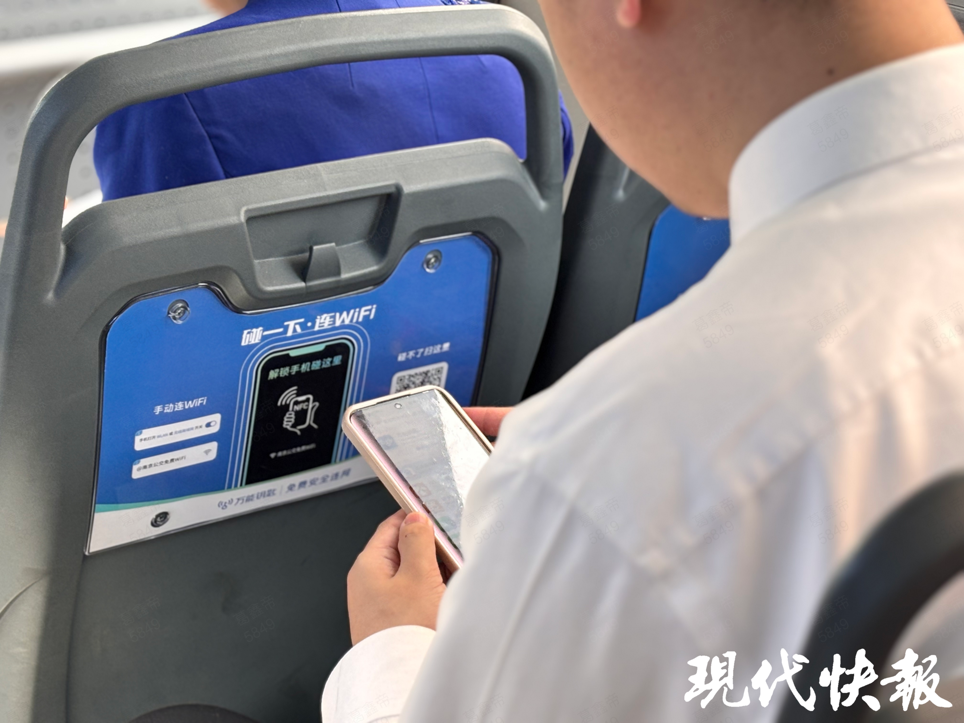 4月30日上午,记者登上停靠在中山码头广场前的一辆小蓝鲸公交。取出手机对着把手、座椅上的南京公交免费WiFi碰一下,就能快速连接免费WiFi,还能通过联网后的“AI生活智能服务体”实时获取公交沿线的餐饮、购物、景点等生活服务信息。