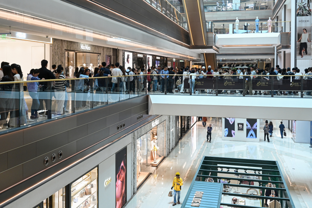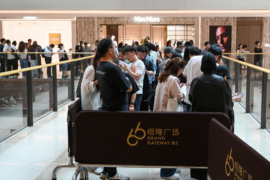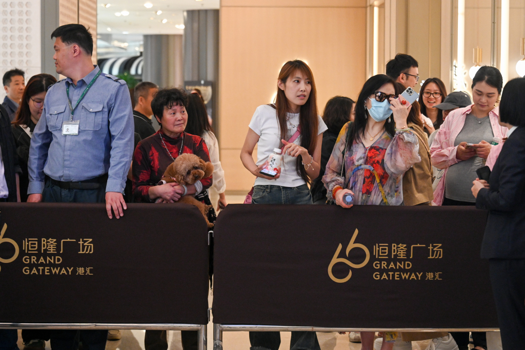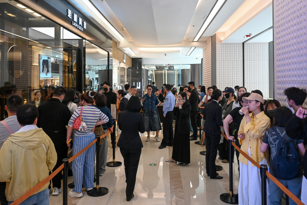 2025年5月1日,老铺黄金上海港汇恒隆广场店正式开市,店门口排队等候的顾客。澎湃新闻记者朱伟辉图