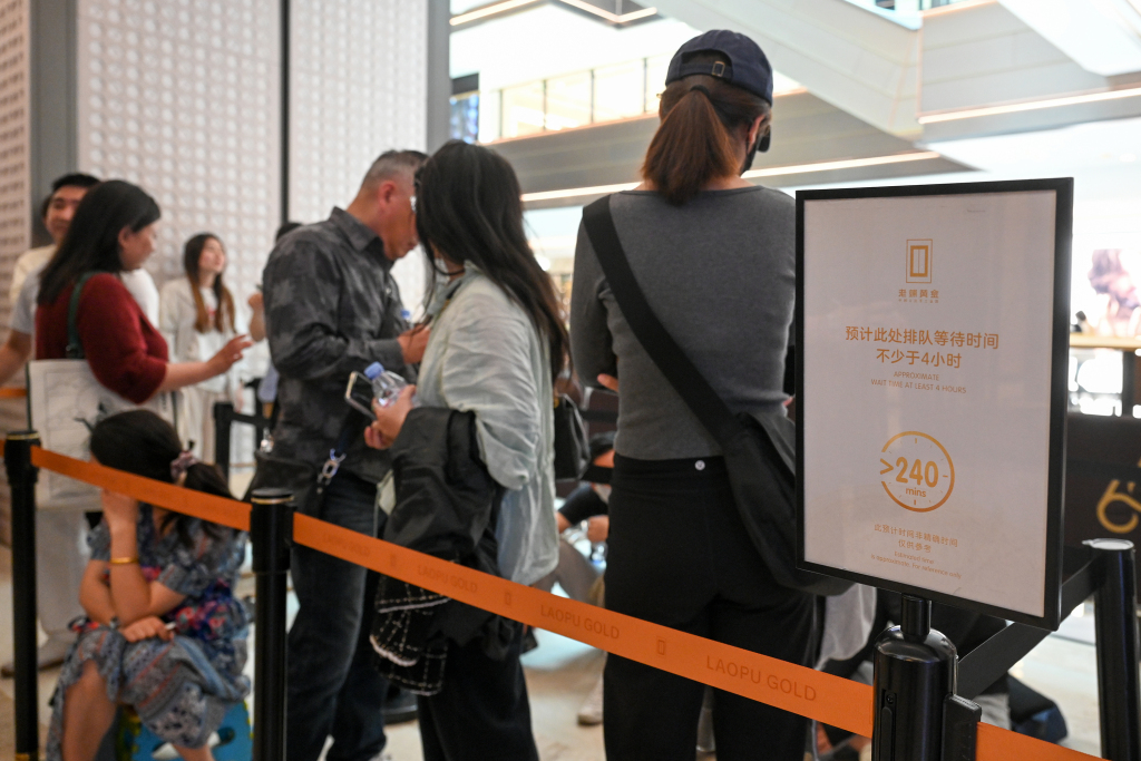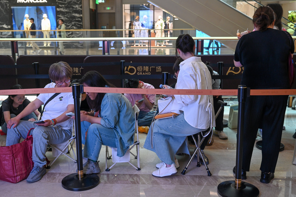 2025年5月1日,老铺黄金上海港汇恒隆广场店,不少顾客自带板凳,坐着等候进店。澎湃新闻记者朱伟辉图
