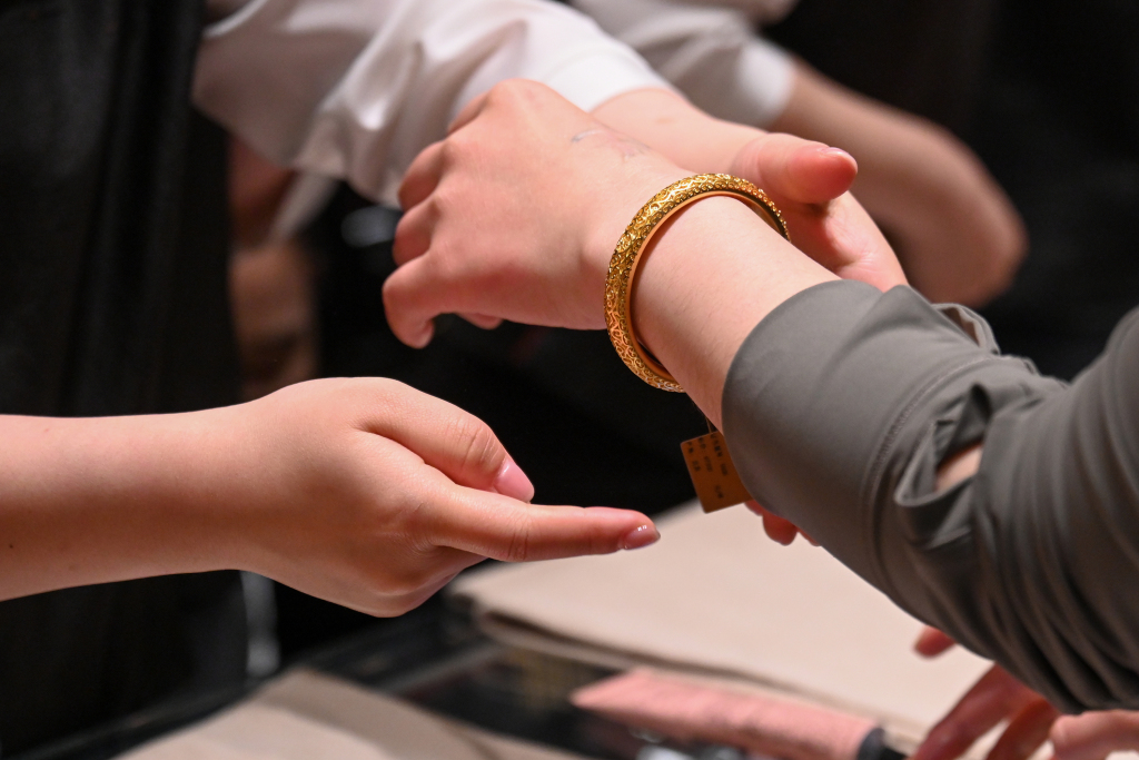 2025年5月1日,老铺黄金上海港汇恒隆广场店,顾客在试戴金手镯。澎湃新闻记者朱伟辉图