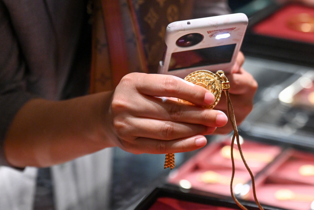 2025年5月1日,老铺黄金上海港汇恒隆广场店,顾客用手机灯光照着查看金饰品。澎湃新闻记者朱伟辉图