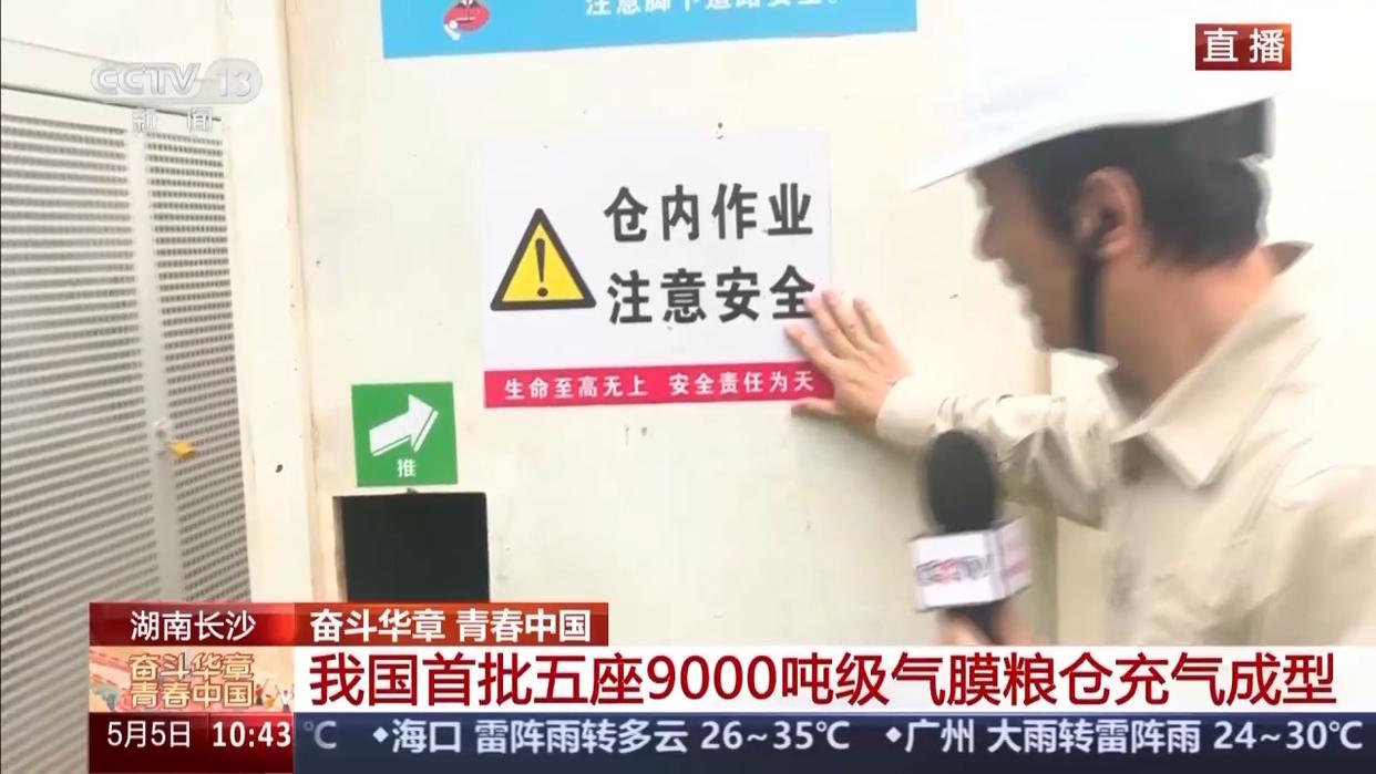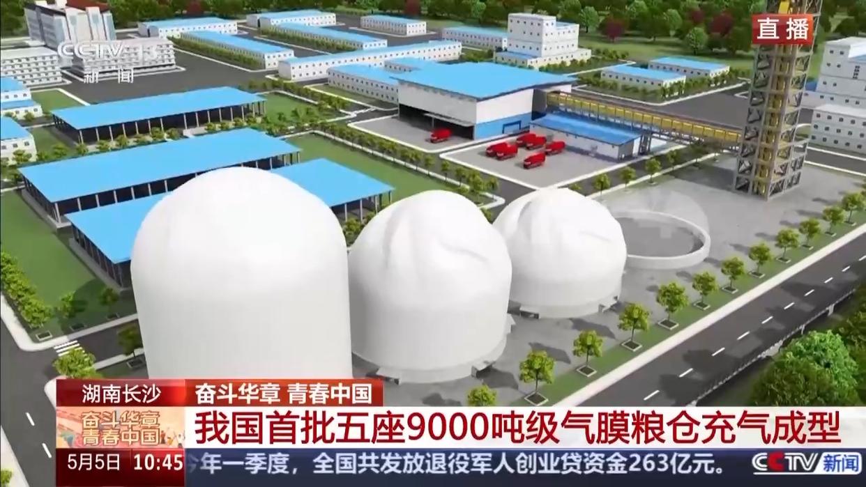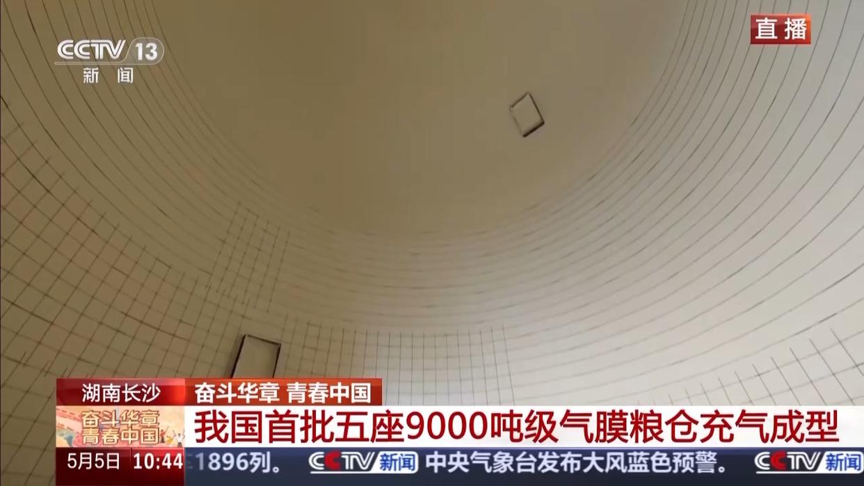 总台央视记者 古峻岭:这里是中储粮长沙直属库。在我身后,第5座气膜仓刚刚充气成型。像这样的一个高大仓体,最快仅需20多分钟便可以充气成型。它们看起来白白胖胖、很萌的样子,但本领可真不一般。