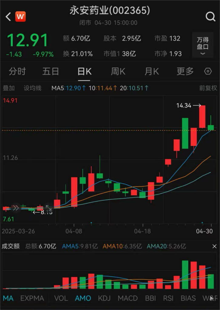 4月30日,永安药业以跌停收盘,报12.91元/股,市值为38亿元。