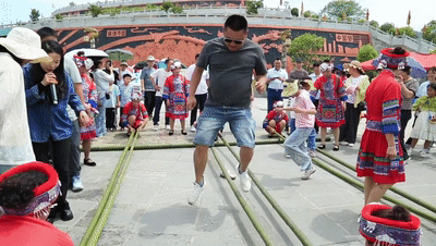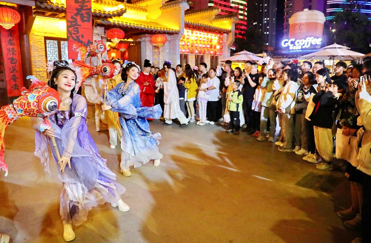 5月3日,游客在河北省秦皇岛市海港区秦皇小巷观看舞蹈演出。新华社发(曹建雄 摄)走进贵州省余庆县飞龙寨景区游客中心广场,身着苗族盛装的演员们手持竹竿,游客随着欢快的节奏跳起迎宾舞。笑声与竹竿敲击声交织成独特的韵律。