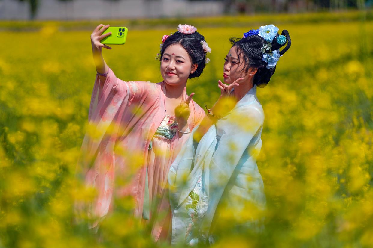 5月4日,身着汉服的游客在河北省遵化市一处花海景区拍照。 新华社发(刘满仓 摄)