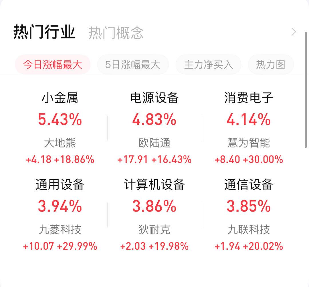 盘面上,市场热点良性轮动,个股涨多跌少,全市场近5000只个股上涨。从板块来看,可控核聚变概念股集体大涨,海陆重工等涨停。鸿蒙、算力概念股震荡走强,南天信息等10余股涨停。机器人概念股继续活跃,南山智尚等多股涨停。板块方面,小金属、可控核聚变、稀土永磁、鸿蒙等板块涨幅居前。截至收盘,沪指涨1.13%,深成指涨1.84%,创业板指涨1.97%。