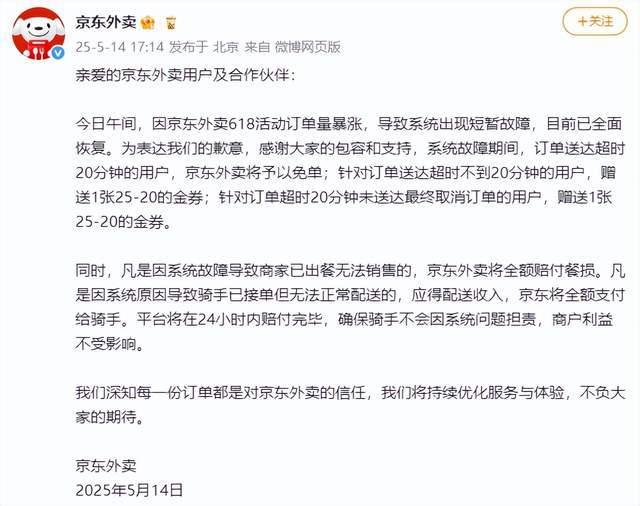 今日午间,因京东外卖618活动订单量暴涨,导致系统出现短暂故障,目前已全面恢复。为表达我们的歉意,感谢大家的包容和支持,系统故障期间,订单送达超时20分钟的用户,京东外卖将予以免单;针对订单送达超时不到20分钟的用户,赠送1张25-20的金券;针对订单超时20分钟未送达最终取消订单的用户,赠送1张25-20的金券。