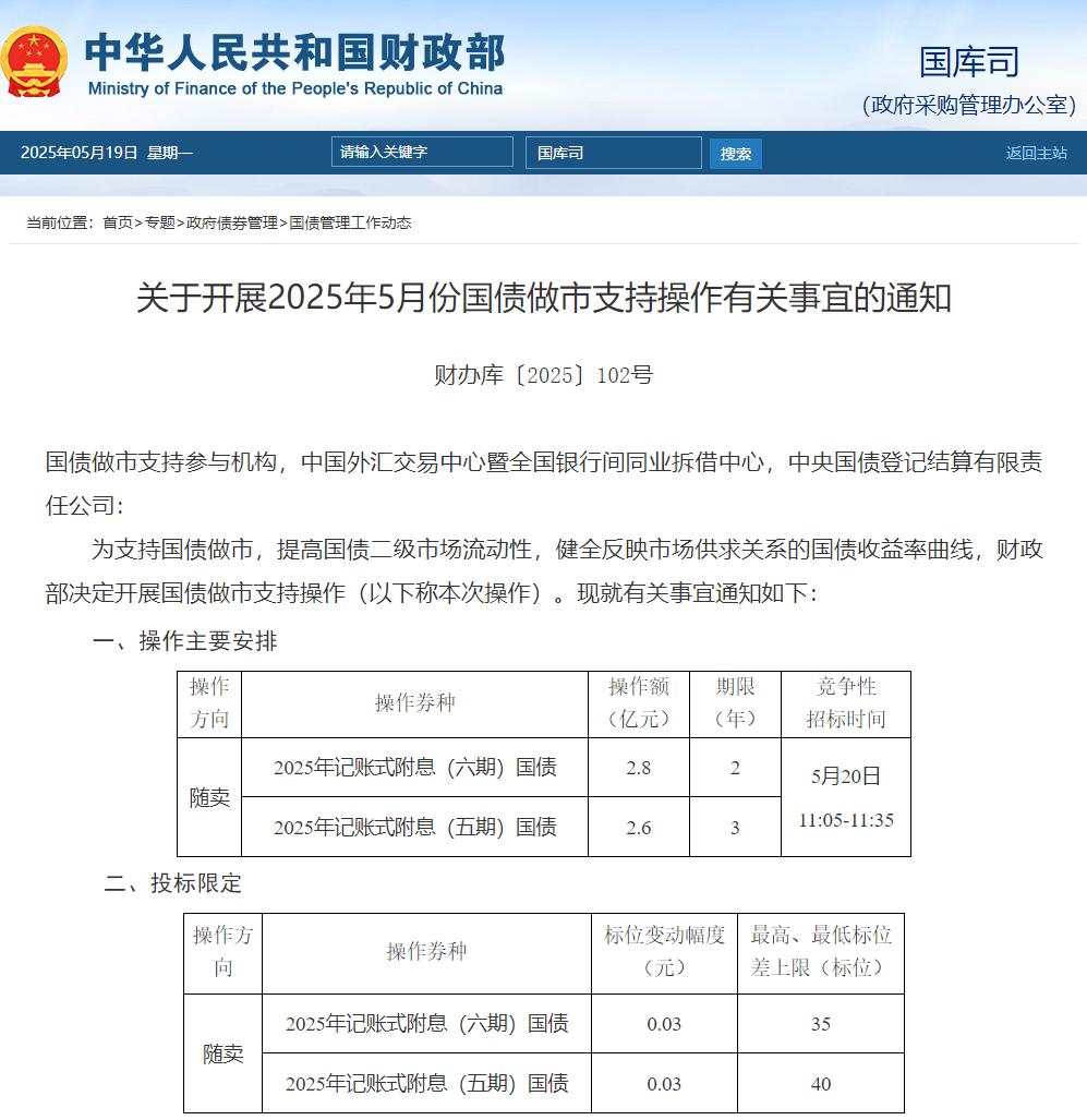 5月19日,财政部发布通知称,为支持国债做市,提高国债二级市场流动性,健全反映市场供求关系的国债收益率曲线,财政部决定开展国债做市支持操作。