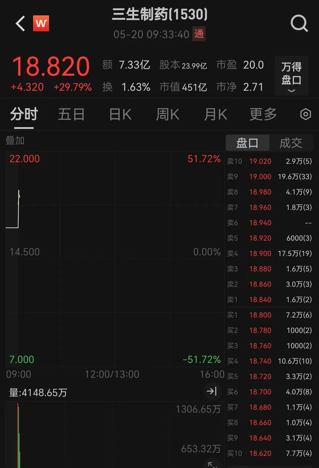5月20日开盘,三生制药股价高开14%。截至发稿,三生制药大涨29.79%,最新市值为451亿港元。