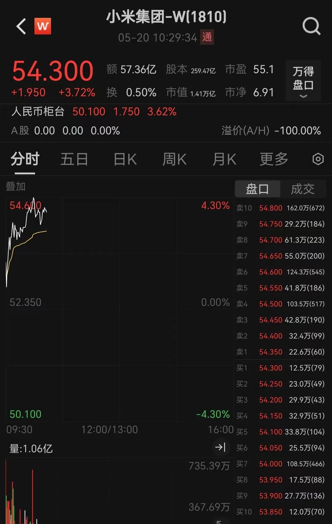截至发稿,小米集团股价为54.3港元/股,涨幅为3.72%,最新市值为1.41万亿港元。
