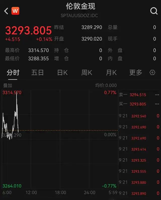 今早,现货黄金又一度拉升突破3300美元/盎司,为5月9日以来首次。截至上午9时22分,黄金价格为3293.805美元/盎司,日内微涨0.14%。